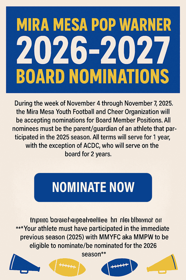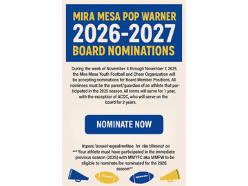 Mira Mesa Pop Warner Football and Cheer Mira Mesa Pop Warner Football and Cheer, PO Box 261156San Diego, California 92126